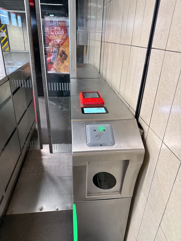 メトロの場合は手前がチケットをかざすところ、奥の赤いリーダーがクレカをかざすところです。